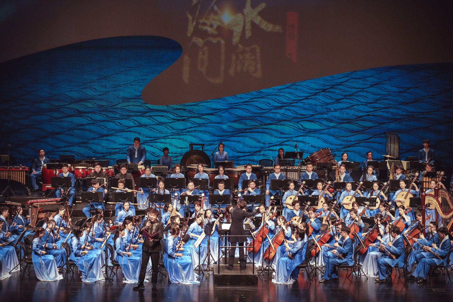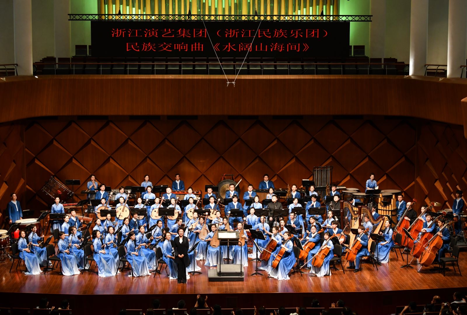 民族交响曲《水阔山海间》是著名作曲家王丹红博士历经三年实地采风、潜心创作而成; 以水之名,依水为路,寻溯钱塘潮涌的源头起点,构筑之江儿女的心灵家园;交响曲由六个乐 章构成,序曲《一苇航之》、第一乐章《水至》、第二乐章《山望》、第三乐章《闹花台》、 第四乐章《缘会》、终曲《水阔山海间》。作品描绘了天高水阔、山海相依的壮美画卷,水之 源、山之巅、海之上,纵情吟唱——扬帆正当时,水阔山海间!