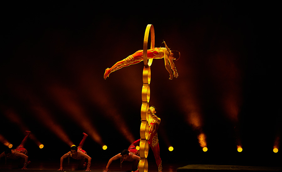 地圈是我国传统杂技节目,要求演员通过助跑、腾跃,快速穿过固定在地上的地圈道具,该节目中,有十多位演员不断挑战越来越高的地圈,在不同组合的地圈里翻腾跳跃,该节目曾获得第七届全国杂技比赛文华杂技节目金奖。