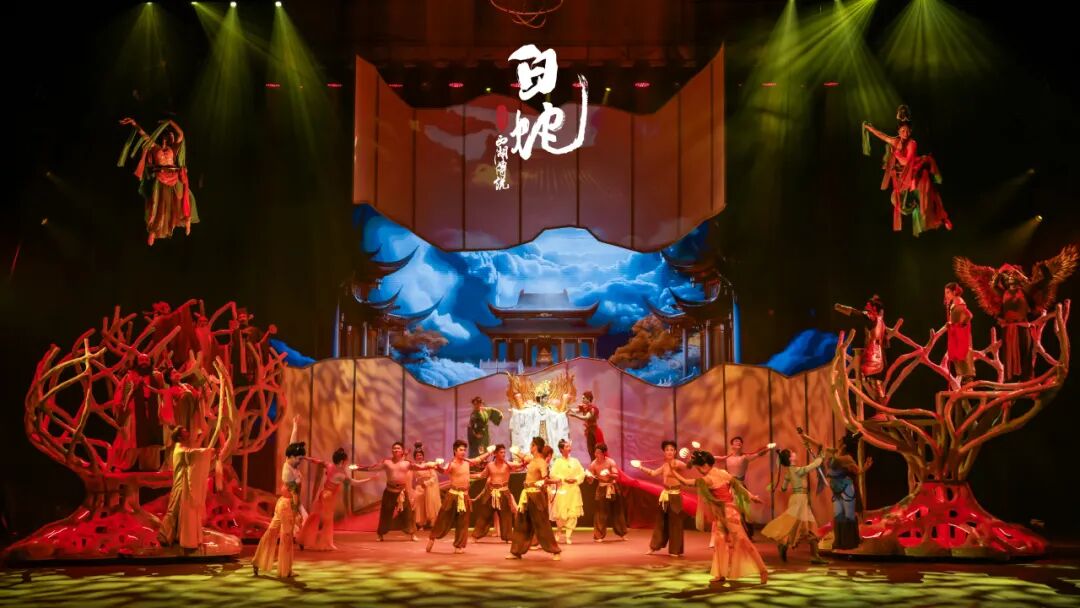 《西湖传说·白蛇》以经典传说为蓝本,融入了杂技与创新剧情。故事始于天宫盛宴,白蛇为寻“因果"与青蛇私闯瑶池,得吕洞宾点拨后,借轮回池下凡。在西湖畔,白素贞与许仙因伞结缘,历经相知、相爱与婚约,却因身份暴露而波折不断。