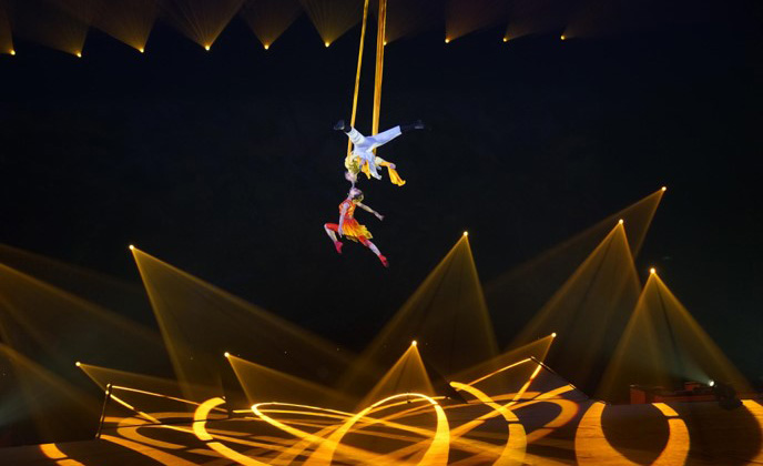 节目灵感来源于家喻户晓的越剧《梁山伯与祝英台》委婉凄美的爱情故事。一男一女两位杂技演员在高空中化身幻化后的梁祝二人,在一群蝴蝶的陪伴下,翩翩起舞,由此表现了现代青年对自由爱情的向往和美好的祝福。杂技演员用杂技动作双人挂脚、口咬旋转、空中缠腿劈叉、前水平支撑、后水平支撑来表现梁祝二人的复杂情感变化、最后根据梁祝两人的生死离别的情感变化,创作了双人口咬倒十字旋转动作,节目曾获第二十一届意大利罗马金色马戏节国防部长奖。